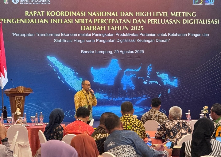 LAMPUNGRADAR24.co.id — Pemerintah Provinsi Lampung bersama Bank indonesia menggelar Rapat Koordinasi Daerah (Rakorda) TPID dan TP2DD 2025. Dalam sambutan Gubernur Lampung yang diwakili Staf Ahli Bidang Ekonomi dan Pembangunan, Bani Ispriyanto, disampaikan apresiasi atas komitmen TPID dan TP2DD menjaga stabilitas ekonomi, mengendalikan inflasi, memperluas digitalisasi, serta memastikan pertumbuhan ekonomi. Inflasi Lampung hingga Juli 2025 tercatat 1,41% (year-to-date), masih terkendali berkat sinergi berbagai program pengendalian harga, termasuk operasi pasar, peningkatan produktivitas pertanian, kerja sama antar daerah, serta edukasi Masyarakat.Sabtu (30/8/25).