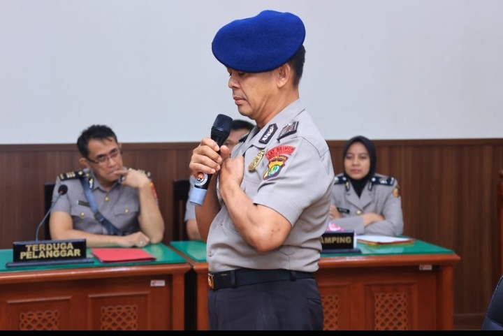 Sidang Komisi Kode Etik Polri (KKEP) berlangsung di Gedung TNCC Mabes Polri, Jakarta Selatan, Kamis malam(4/9/2025). Dalam sidang itu, Bripka Rohmat menyampaikan penyesalan mendalam serta permintaan maaf kepada keluarga korban.
