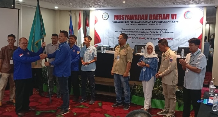 LAMPUNGRADAR24.co.id — Musyawarah Daerah (Musda) VI Federasi Serikat Pekerja Pertanian dan Perkebunan (F SPP K SPSI) Provinsi Lampung berlangsung sukses dengan melahirkan kepengurusan baru untuk periode 2025-2030. Ishak Hendra Purnama Putra SE, putra dari tokoh pekerja Resmi, terpilih sebagai Ketua Umum yang baru setelah dilantik secara langsung oleh Ketua Umum SPSI Pusat, Ahmad Munji.
