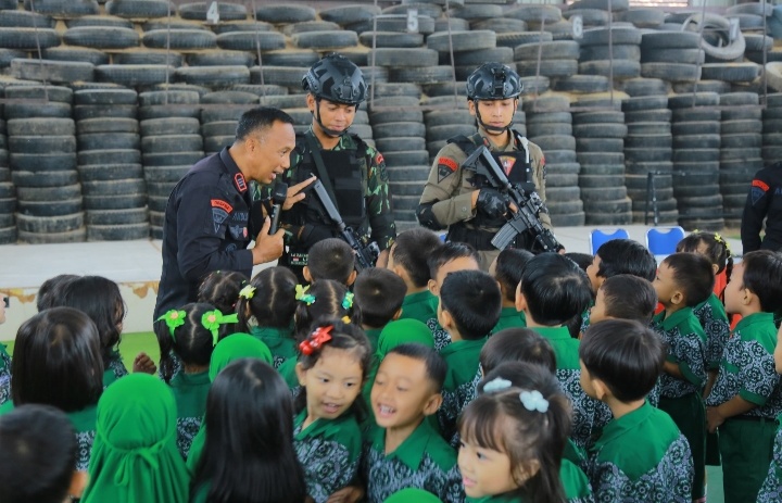 Personel Brimob dengan ramah memberikan penjelasan sederhana, permainan edukatif, serta simulasi ringan agar mudah dipahami anak-anak. Kegiatan ini diharapkan menanamkan rasa disiplin, cinta tanah air, dan mengenalkan profesi Polri sejak dini.