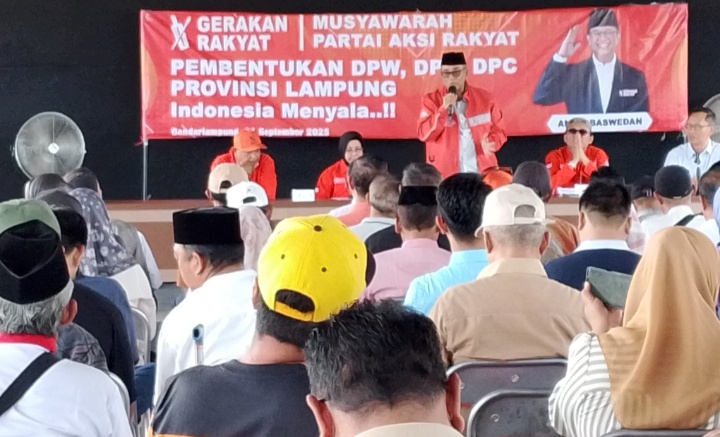 LAMPUNGTADAR24.co.id — Suasana penuh semangat menyelimuti Gedung Meneng Global Surya di Jalan ST Jamil No. 01, Kecamatan Rajabasa, Kota Bandarlampung, Minggu (21/9/2025) Siang. Ratusan kader dan simpatisan hadir dalam acara pembentukan Dewan Pimpinan Wilayah (DPW) Partai Aksi Rakyat Provinsi Lampung, yang menjadi tonggak penting dalam memperkuat basis politik nasionalis berbasis Rakyat di tanah Lampung.