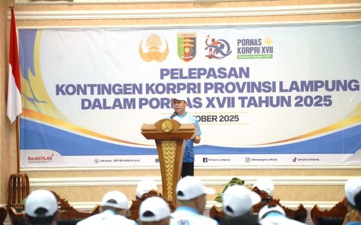 LAMPUNGRADAR24.co.id—- Gubernur Lampung diwakili Sekretaris Daerah Provinsi Lampung, Marindo Kurniawan, secara resmi melepas Kontingen Korpri Provinsi Lampung yang akan mengikuti Pekan Olahraga Nasional (Pornas) XVII Korpri Tahun 2025 di Palembang Sumatera Selatan, Kamis (2/10/25), bertempat di Balai Keratun Lt. III.