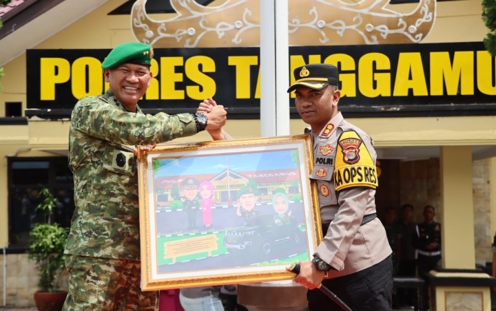 Dalam kesempatan itu, Kapolres Tanggamus AKBP Rahmad Sujatmiko menyerahkan souvenir kenang-kenangan berupa gambar karikatur dalam bingkai kepada Pangdam XXI/Radin Inten sebagai tanda kehormatan dan simbol sinergitas TNI-Polri di wilayah Tanggamus.