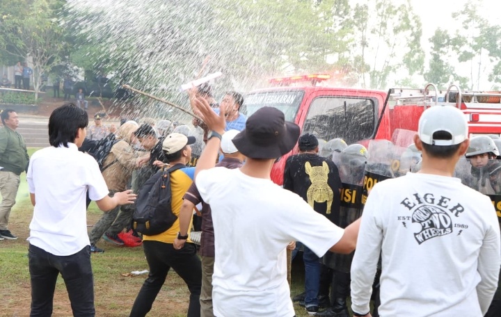 Kegiatan dilanjutkan dengan simulasi pengendalian massa, dimulai dari deteksi dini, langkah preventif, hingga penanganan demonstrasi secara bertahap menggunakan formasi Dalmas Awal dan Dalmas Lanjut. Simulasi ini menjadi ajang evaluasi kesiapan personel, perlengkapan, serta sistem komando pengendalian Polres Pesawaran.