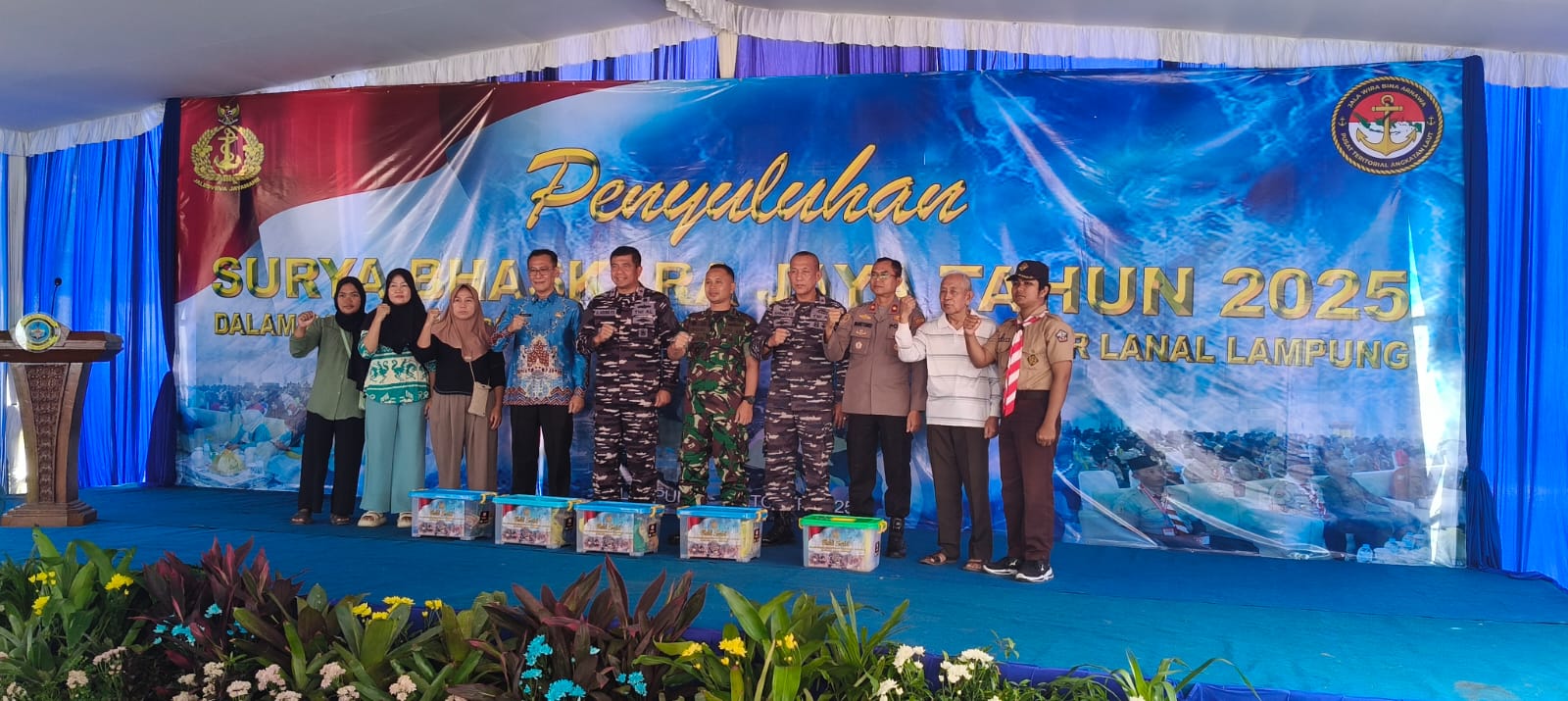 Bhakti sosial yang dimulai pukul 08.00 WIB itu dihadiri oleh sejumlah pejabat tinggi, di antaranya Danpusteral Mabesal Laksma TNI Albertus Agung Pryo.S, Danlanal Lampung Kolonel Laut Krido Satryo U., serta perwakilan Walikota Bandar Lampung, Wilson Faisol. Turut hadir perwakilan dari Polresta Bandar Lampung, BKKBN, BNN, dan instansi terkait lainnya.