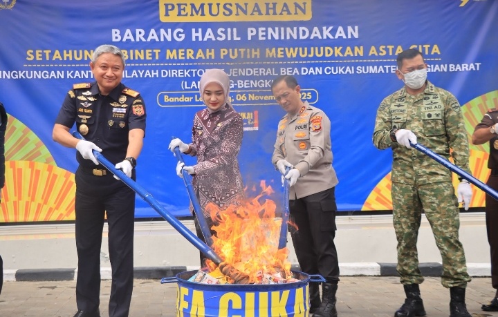 Bea Cukai Kanwil Lampung juga telah berhasil memusnahkan barang hasil penindakan sebanyak 29,8 juta batang rokok ilegal yang diamankan sejak September 2024 hingga Oktober 2025.