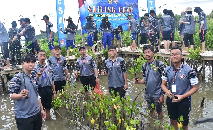 Peserta Sailing Camp juga turut melaksanakan kegiatan penanaman mangrove di Kampung Bahari Nusantara (KBN) Sidodadi, daerah binaan Lanal Lampung. Kegiatan ini bertujuan menjaga kelestarian ekosistem laut dan menanamkan rasa tanggung jawab terhadap lingkungan pesisir.