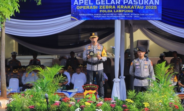 LAMPUNGRADAR24.co.id– Polda Lampung melaksanakan Apel Gelar Pasukan Operasi Zebra Krakatau 2025 di Lapangan Mapolda Lampung, Senin (17/11/25).