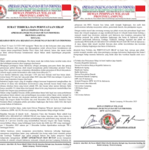LAMPUNGRADAR24.co.id — Ketua DPW ALUN Lampung Helman Saleh didampingi Sekretaris Muhammad Asykar menyampaikan kekhawatiran nya atas bencana Alam yang terjadi di Indonesia sampai saat ini, atas dasar peristiwa tersebut DPW ALUN Provinsi Lampung membuat Surat Terbuka dan Pernyataan Sikap, Kamis (04/12/2025).