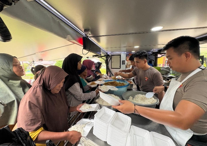 Personel Brimob Lampung tampak bahu-membahu menyiapkan dan mendistribusikan makanan siap saji kepada warga sekitar, termasuk kelompok rentan yang masih berjuang memulihkan kondisi pascabencana.