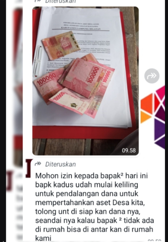Menurut informasi yang dihimpun, seluruh Kepala Keluarga (KK) di Desa Agom diminta iuran sebesar Rp60 ribu,yang kegunaan uang dari masyarakat itu untuk membayar kuasa hukum Pemdes Agom dalam pengamanan aset desa yang saat ini sedang bersengketa di Pengadilan Negeri (PN) Kalianda Lampung Selatan.