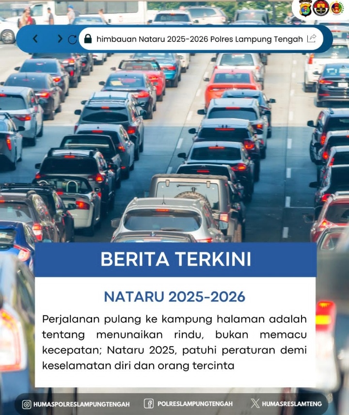 LAMPUNGRADAR24.co.id– Polres Lampung Tengah mengimbau kepada seluruh Masyarakat yang akan melakukan perjalanan mudik maupun liburan selama periode Natal dan Tahun Baru (Nataru) 2025-2026 untuk selalu mematuhi peraturan lalu lintas.