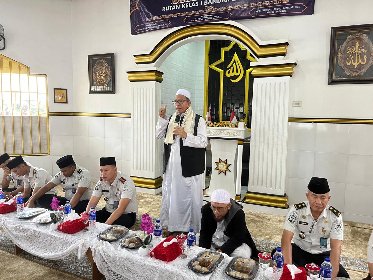 Kepala Rutan Kelas I Bandar Lampung, Tri Wahyu Santosa, dalam sambutannya menyampaikan bahwa peringatan Isra Mi’raj menjadi sarana pembinaan rohani yang sangat penting bagi warga binaan dan jajaran rutan.
