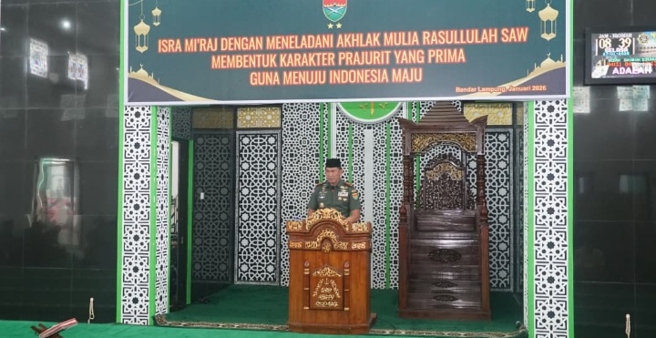 LAMPUNGRADAR24.co.id– Panglima Komando Daerah Militer (Pangdam) XXI/ Radin Inten, Mayor Jenderal (Mayjen) TNI Kristomei Sianturi, S.Sos., M.Si., (Han), melaksanakan kegiatan peringatan Hari Isra Mi’raj Nabi Muhammad SAW 1447 H/ 2026 M yang berlangsung khidmat di Masjid Al – Ikhlas Makodam XXI/Radin Inten, pada hari Selasa (27/01/2026)