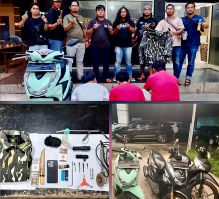 Selain itu, turut diamankan 4 unit sepeda motor berbagai jenis, senter, kunci pas, 1 set alat hisap sabu (bong) yang masih terdapat serbuk putih, serta beberapa unit telepon genggam.