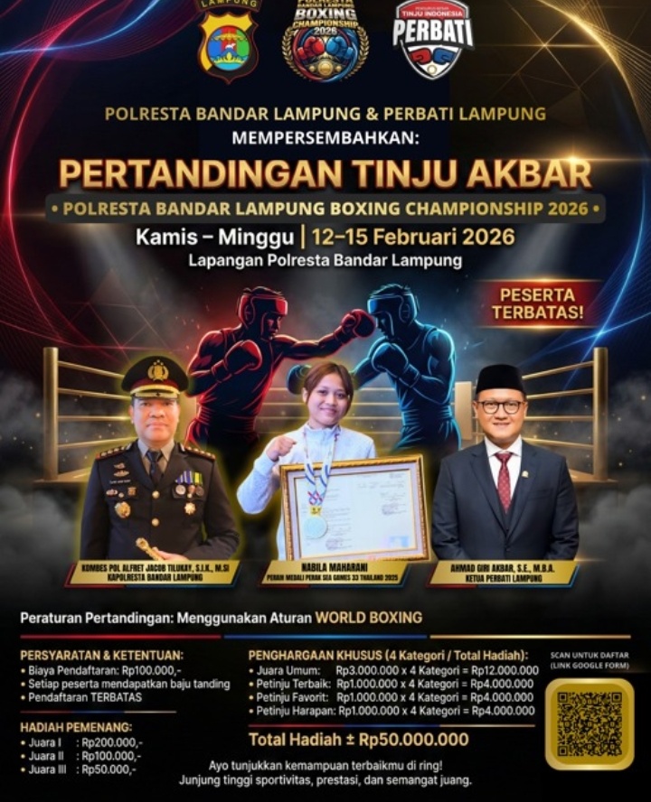 LAMPUNGRADAR24.co.id– Polresta Bandar Lampung bekerja sama dengan Persatuan Tinju Amatir Indonesia (Perbati) Lampung akan menggelar pertandingan tinju bertajuk Polresta Bandar Lampung Championship 2026. Kegiatan tersebut akan berlangsung selama empat hari, mulai Kamis hingga Minggu, 12–15 Februari 2026, di Lapangan Polresta Bandar Lampung.