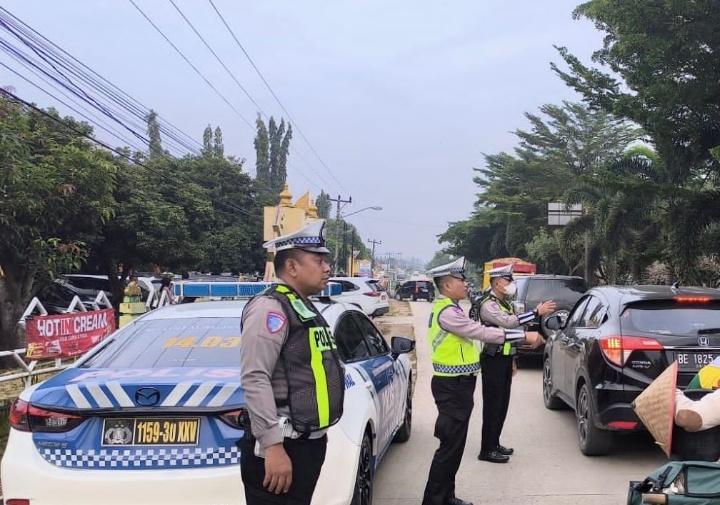 Petugas juga melakukan pengaturan arus lalu lintas guna mengantisipasi kepadatan kendaraan selama kegiatan berlangsung.