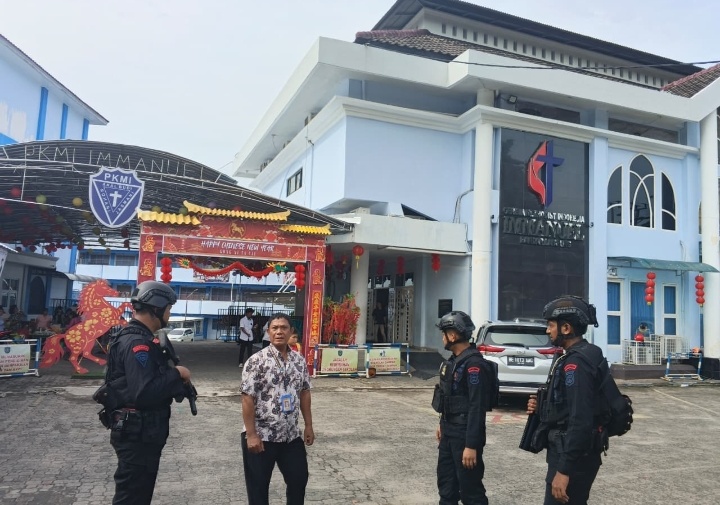 LAMPUNGRADAR24.co.id – Detasemen Gegana Satbrimob Polda Lampung melaksanakan patroli dialogis dan pengamanan di sejumlah gereja di Kota Bandar Lampung pada Minggu (15/02/26)