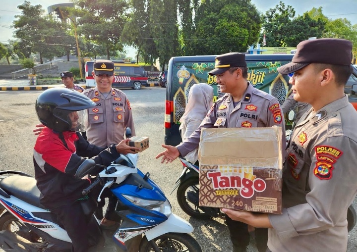Seperti yang dilaksanakan pada Sabtu sore (21/2/26), Sat Binmas Polres Lampung Tengah membagikan sebanyak 350 paket takjil kepada para pengendara R2 maupun R4 yang melintas di Jalan Lintas Sumatera, tepatnya di Simpang Tugu Pepadun, Gunung Sugih, Lampung Tengah.