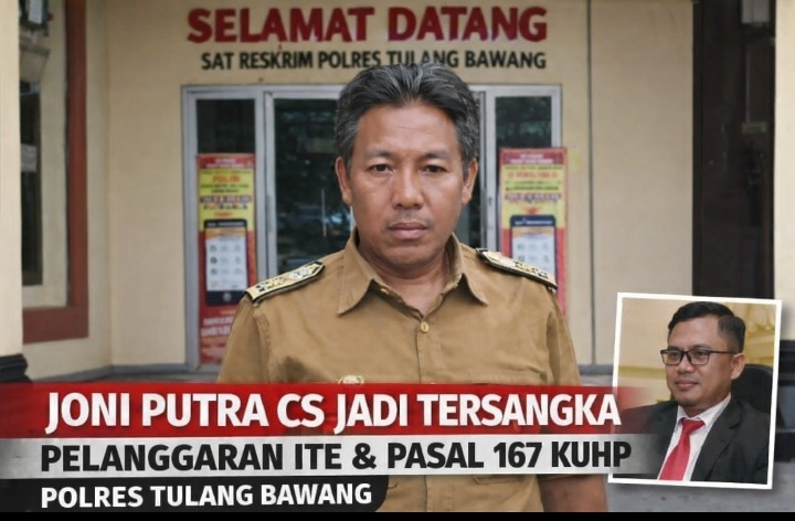 LAMPUNGRADAR24.co.id– Polres Tulang Bawang resmi menetapkan Joni Putra bersama dua rekannya, Kopiah dan Melodi, sebagai tersangka dalam dua perkara berbeda, yakni dugaan pelanggaran Undang-Undang Informasi dan Transaksi Elektronik (ITE) serta dugaan memasuki rumah atau pekarangan orang lain tanpa izin sebagaimana diatur dalam Pasal 167 KUHP.