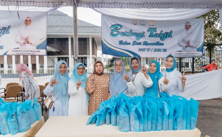 LAMPUNGRADAR24.co.id– Memasuki hari keenam pelaksanaan kegiatan berbagi takjil Ramadan 1447 Hijriah, Tim Penggerak PKK Provinsi Lampung bersama Dharma Wanita Persatuan (DWP) Provinsi Lampung kembali membagikan paket berbuka puasa kepada Masyarakat di depan Mahan Agung, Minggu (01/03/2026).
