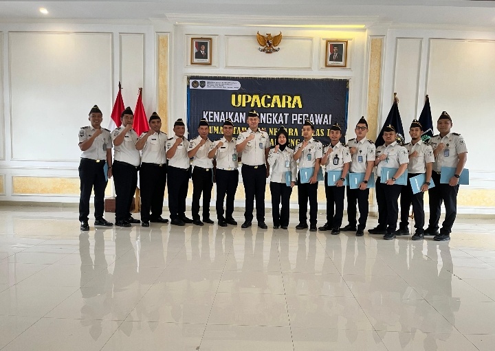 LAMPUNGRADAR24.co.id – Rutan Kelas I Bandar Lampung melaksanakan kegiatan upacara kenaikan pangkat Penyesuaian Ijazah dan Ujian Dinas, bertempat di Aula Rutan Kelas I Bandar Lampung. Kegiatan ini dipimpin langsung oleh Kepala Rutan, Tri Wahyu Santosa, serta diikuti oleh pejabat struktural dan seluruh pegawai. Senin (02/03/26).