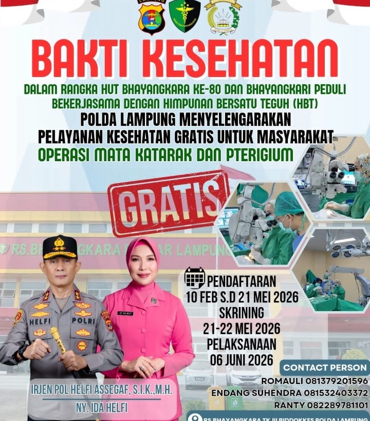 LAMPUNGRADAR24.co.id – Dalam rangka menyambut Hari Bhayangkara ke-80, Polda Lampung menggelar kegiatan Bakti Kesehatan berupa operasi mata gratis bagi Masyarakat yang menderita katarak dan pterigium.