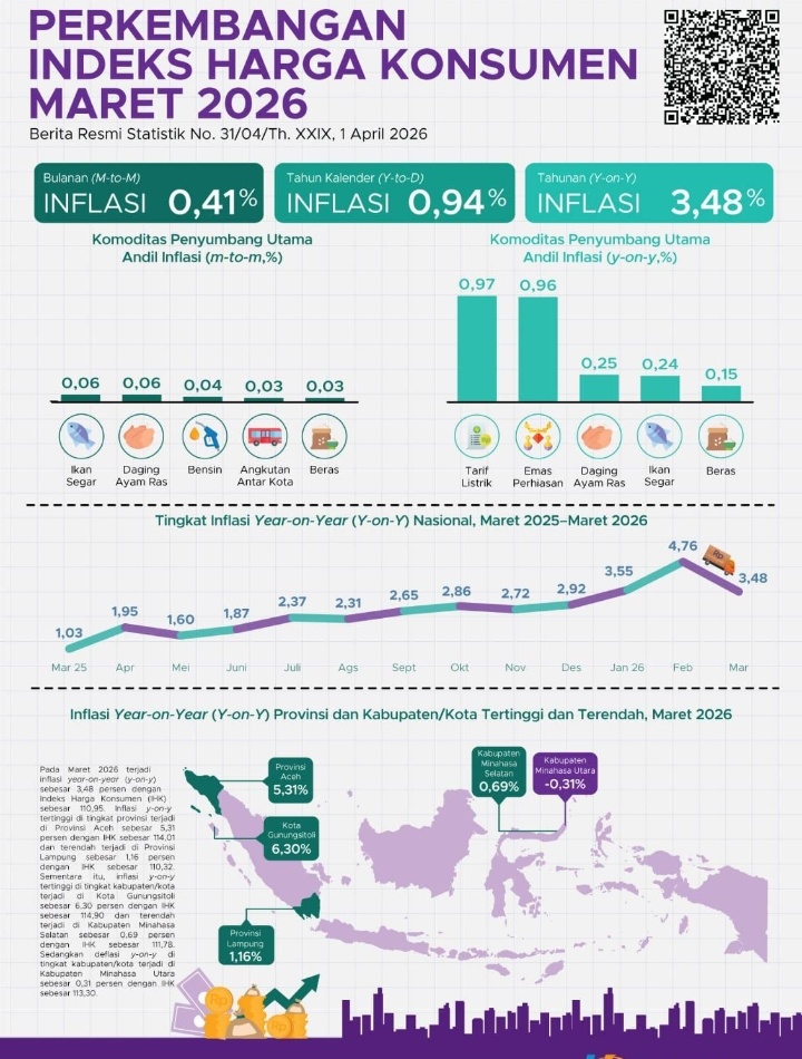 LAMPUNGRADAR24.co.id— Perkembangan Indeks Harga Konsumen (IHK) pada Maret 2026 menunjukkan tren inflasi yang tetap terkendali, baik di tingkat nasional maupun daerah. Data resmi yang dirilis Badan Pusat Statistik mencatat inflasi bulanan (month-to-month) sebesar 0,41 persen, inflasi tahun kalender (year-to-date) sebesar 0,94 persen, dan inflasi tahunan (year-on-year) sebesar 3,48 persen.