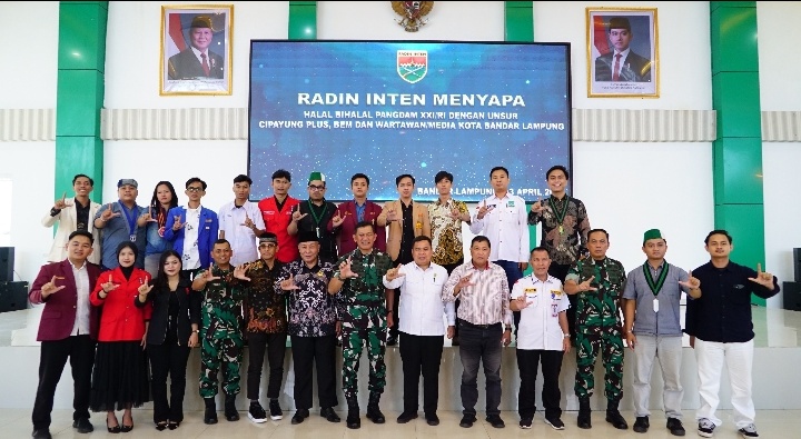 LAMPUNGRADAR24.co.id– Kodam XXI/Radin Inten menggelar kegiatan silaturahmi dan halal bihalal bersama Organisasi Kepemudaan (OKP) Cipayung Plus, LMID, unsur Badan Eksekutif Mahasiswa (BEM), serta wartawan/media wilayah Lampung. Kegiatan ini dipimpin langsung oleh Pangdam XXI/Radin Inten, Mayjen TNI Kristomei Sianturi, S.Sos., M.Si. (Han), mengusung tema “Kodam XXI/RI Kolaborasi Untuk Negeri”, bertempat di Aula Sudirman Makodam XXI/RI, Jl. Teuku Umar No. 85, Kelurahan Penengahan, Kecamatan Kedaton, Kota Bandar Lampung, pada hari Senin (13/04/2026).
