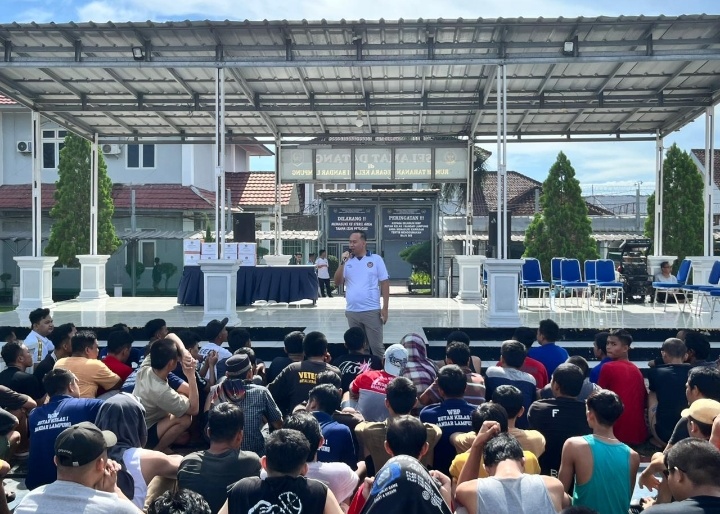 Kepala Rumah Tahanan Negara (Rutan) Kelas I Bandar Lampung, Tri Wahyu Santosa, memberikan pengarahan kepada seluruh warga binaan terkait pencegahan dan pemberantasan HALINAR (Handphone, Pungutan Liar, dan Narkoba) pada Sabtu (25/04/2026). Kegiatan ini dilaksanakan di lapangan Rutan Kelas I Bandar Lampung dan diikuti dengan tertib serta penuh perhatian oleh para warga binaan.
