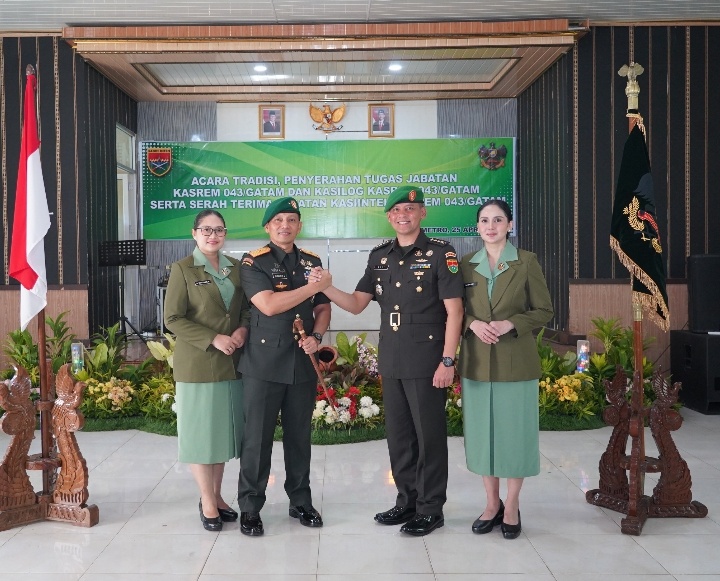 Kegiatan yang berlangsung di Makorem 043/Gatam, Jalan Veteran, Hadimulyo Barat, Kota Metro, itu menandai penyerahan tugas jabatan Kasrem kepada Kolonel Kav Roli Dewanto, S.E., M.Tr (Han), serta Kasilog kepada Kolonel Inf Agung Budhi Purnomo. Sementara itu, jabatan Kasiintel diserahterimakan dari Kolonel Inf Harizoni Pulungan, S.E., kepada Letkol Inf Jarot Susanto, S.H., M.Si.